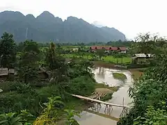 Vang Vieng (ວັງວຽງ), sometimes spelled Vang Viang, is a riverside town in Central Laos. It is the adventure capital of Laos, with a river flowing through the spectacularly wild karst formations, laid-back countryside and many caves. Many outdoor tours are available.
