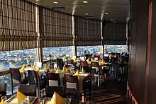 - 🌍 Donauturm Café (Danube Tower Restaurant), Donauturmstraße 4 (U1 VIC/Kaisermühlen, bus 20B to Danube Tower, you have to pay for the elevator first: €5.90 for adults), ☏ +43 1 2633572. 11:30-15:00, 18:00-24:00. On a sunny day you can have a look over Vienna from the rotating restaurant. It is a non-smokers' restaurant.