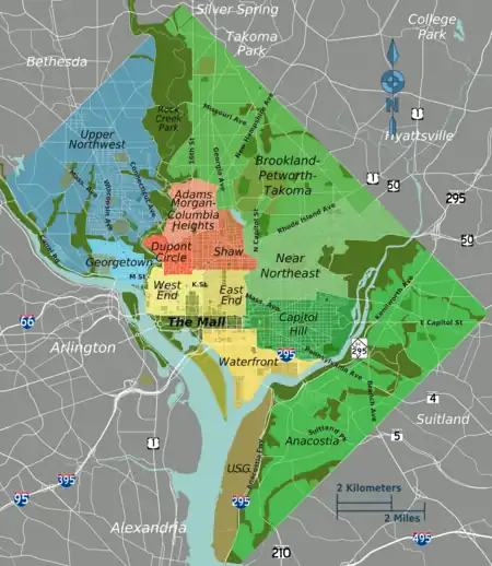 North Central (Dupont Circle, Shaw, Adams Morgan-Columbia Heights) D.C.'s trendiest and most diverse neighborhoods and destination number one for live music and clubbing, as well as loads of restaurants, Howard University, boutique shopping, beautiful embassies, Meridian Hill Park, U Street, and lots of nice hotels. |