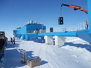 - π Neumayer-Station III (Germany), opened in 2009, is named for the geophysicist and explorer who was an early proponent of international scientific cooperation. It's in Atka Bay on the EkstrΓΆm Ice Shelf, 6 km south of the abandoned Neumayer II (1993-2009) which became buried in snow, as did Neumayer I (1981-1992). The station is fixed on stilts so it can be periodically raised, though it continues to move towards the ice edge at 160 m / year.