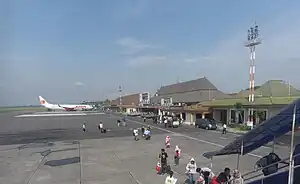 - π Adisucipto International Airport (JOG IATA), Jl Solo (8 km (5.0 mi) east of the city), β +62 274 484261. A small but busy, mostly domestic hub; it only serves domestic propeller planes to Bandung, Denpasar, and Surabaya. There is a tourist information desk and ATMs in the arrival hall.