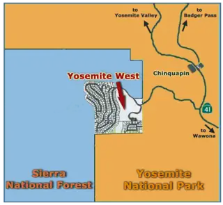Yosemite West is a small community in the southern area of Yosemite National Park just off Wawona Road, a continuation of California north of Fresno. It is situated one mile (1.6 km) south of the Chinquapin intersection of Wawona Road and Glacier Point Road at an altitude of 5,100–6,300 ft (1,550–1,900 m). Just outside the western boundary line of the National Park, Yosemite West is not subject to strict Park limitations on development. There are permanent residents in Yosemite West, and homes, apartments, condos and Bed & Breakfast establishments that are available as rentals for National Park visitors.