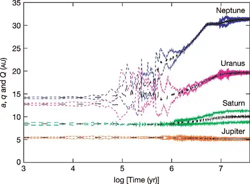The first paper on the Nice model (all three are given in my footnotes) states that Jupiter and Saturn's orbits entered a 1:2 resonance, which then caused their orbits to become eccentric, thereby knocking out Uranus and Neptune. Looking at the image given above, though, they eventually settled down, while Uranus and Neptune bore the brunt of change. Let's reverse that and put Uranus and Neptune in a resonance.