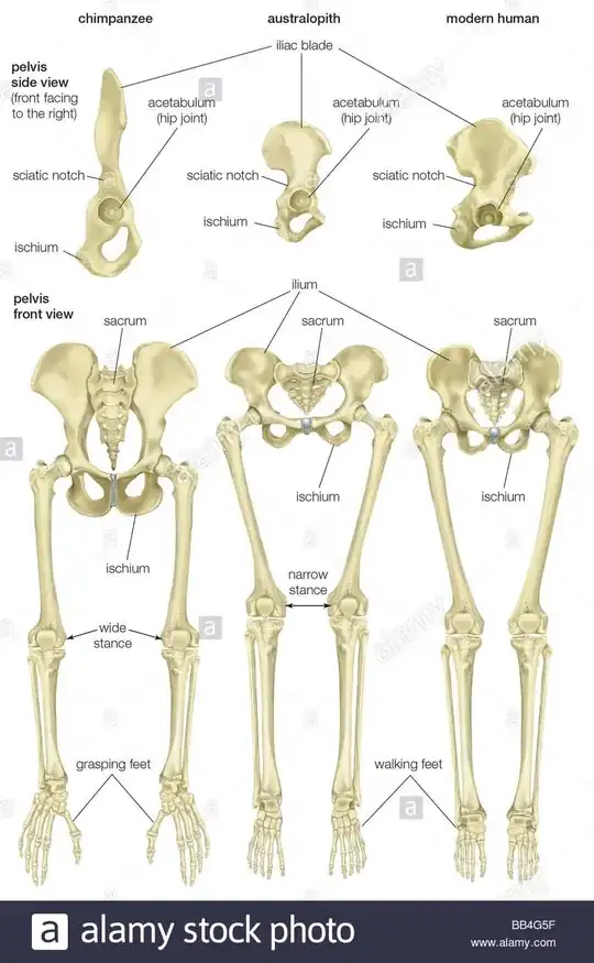 We can see that more quadrupedal primate, the chimpazee hip, is more similar to the dog hip, being long, narrow and flat while the human hip is shorter, wide and "bowl-shaped".