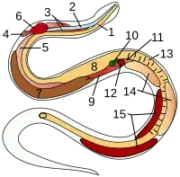 Anatomy of a snake. 1 esophagus, 2 trachea, 3 tracheal lungs, 4 rudimentary left lung, 5 right lung, 6 heart, 7 liver, 8 stomach, 9 air sac, 10 gallbladder, 11 pancreas, 12 spleen, 13 intestine, 14 testicles, 15 kidneys.