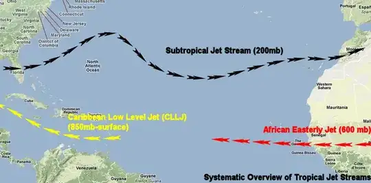 - travels across the ocean and partly over the continent. Due to Coriolis force it then circles back over the ocean, before hitting the other side of the continent and then being turned back into the ocean again, again to Coriolis force. Effectively like a gigantic atmospheric gyre.