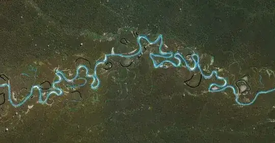 - Pick two points, the places where you want this portion of the river to start and end. Call them $p_1(x_1,y_b)$ and $p_2(x_2,y_b)$, and put them in the set of points, $P$. I give them the same $y$-values, for simplicity's sake; you can rotate the map any angle you choose, and we might as well keep things horizontal. Let's also set $y_b=0$.